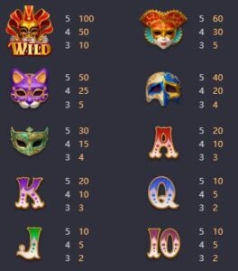 - 魅力的なテーマ:このゲームは、マスク、パーテイ―要素、祭りの装飾のシンボルを備えた活気のあるカーニバルを舞台としています。