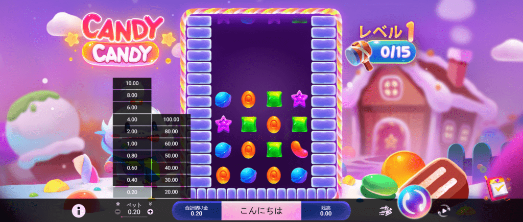 - カラフルなシンボル:プレイヤーは、リールを回転させながら、赤いゼリービーン、オレンジの円、紫の星、緑の四角、青いボンボンなど、さまざまな超甘いシンボルに出会います。これらのシンボルは、視覚的な魅力に加えて、潜在的な勝利の組み合わせに貢献します。