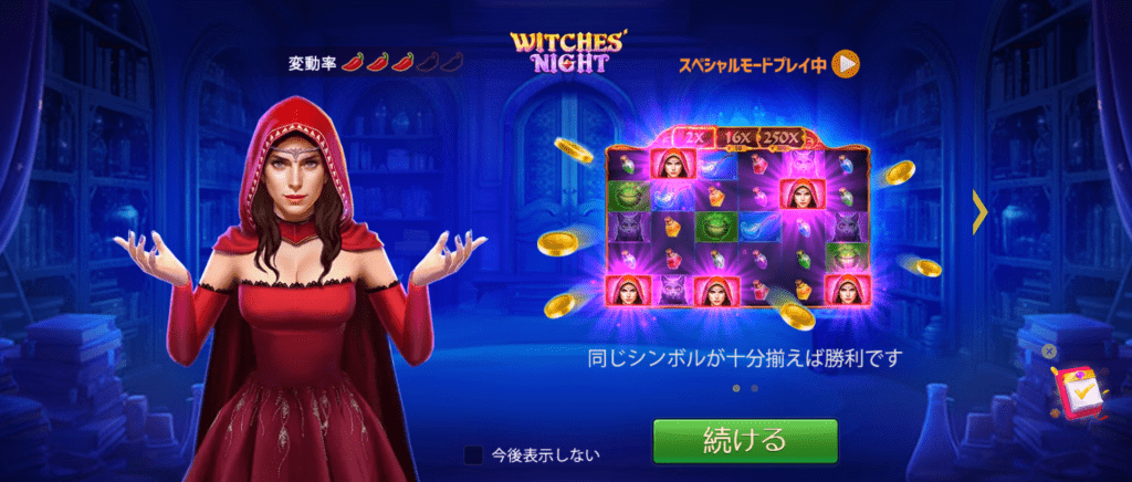 - クラスターペイ: 通常のペイラインではなく、「魔女の夜」は隣接するシンボルをグループ化して勝利を形成するクラスターペイ機構を使用しています。