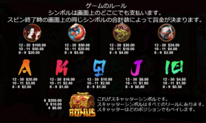 - スキャッターの勝ち: 8 ~ 9 個の一致するスキャッター シンボルが出現すると、賭け金の 0.25 ~ 10 倍が支払われます。一方、12 個以上のスキャッター シンボルでは、賭け金の 2 ~ 50 倍が与えられます。