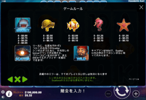 - ワイルドシンボル: サメのシンボルがワイルドとして機能し、スキャッターを除くすべてのシンボルの代わりとなり、勝利の組み合わせを作り出します。