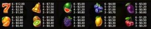 - シンボル: ゲームにはさまざまなフルーツ シンボル、ベル、ラッキー セブンが登場します。チェリー、レモン、ブドウ、キウイフルーツ、オレンジ、プラム、ブラックベリー、スイカが通常のペイアウトとなります。ベルとラッキー セブンはより高いペイアウトを提供します。